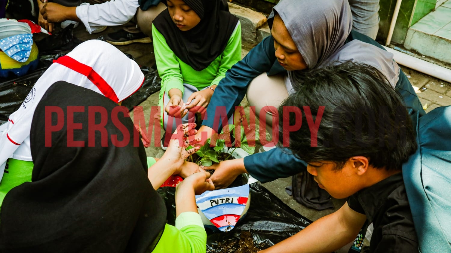 Pada sesi kedua, kegiatan dilanjutkan di luar kelas dalam bentuk praktik langsung. Mahasiswa KKN mengajak siswa untuk menghias galon bekas menjadi pot tanam yang lebih menarik secara visual. Meskipun sebelumnya sekolah telah memiliki pot galon, bentuknya masih polos dan belum menarik. Inovasi yang dihadirkan dalam program ini adalah mengajak siswa membuat pot hias baru dari galon bekas. Pot-pot tersebut kemudian dihias menggunakan cat warna-warni agar terlihat lebih menarik dan estetis. Galon yang telah dihias akan dikeringkan di bawah sinar matahari. Setelah itu, dilanjutkan dengan proses penanaman bibit stroberi ke dalam pot hasil karya mereka masing-masing.