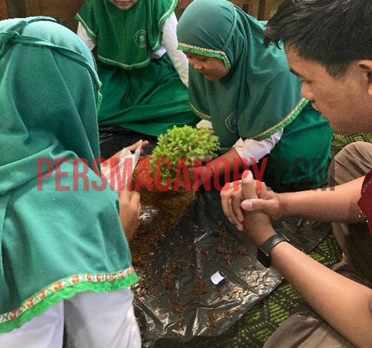 Foto kegiatan praktik pembuatan kokedama bersama siswa MI Miftahul Ulum Desa Dawuhan