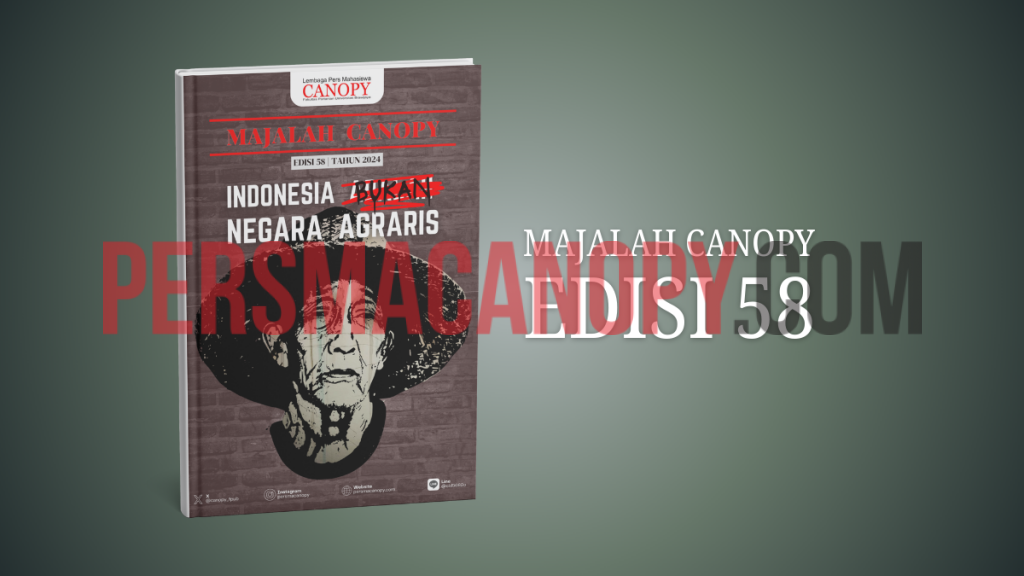 Setelah 6 tahun tenggelam dalam lautan, Majalah Canopy kini telah naik lagi ke permukaan. Senang rasanya menyapa lagi para pembaca. Pada edisi ke 58 ini, tema besar yang kami angkat adalah “Indonesia (Bukan) Negara Agraris”. Tema ini bermula dari sebuah pertanyaan, apakah Indonesia masih layak menyandang nama agraris setelah terkuaknya berbagai permasalahan tak berujung di bidang pertanian? Selengkapnya bisa pembaca nikmati melalui tautan berikut.